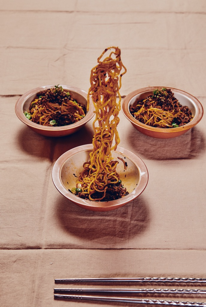 4. When ready to serve, divide the noodles among the four bowls with the sauce and top with the ground meat. Garnish with the scallions and a dash of roasted Sichuan pepper.
