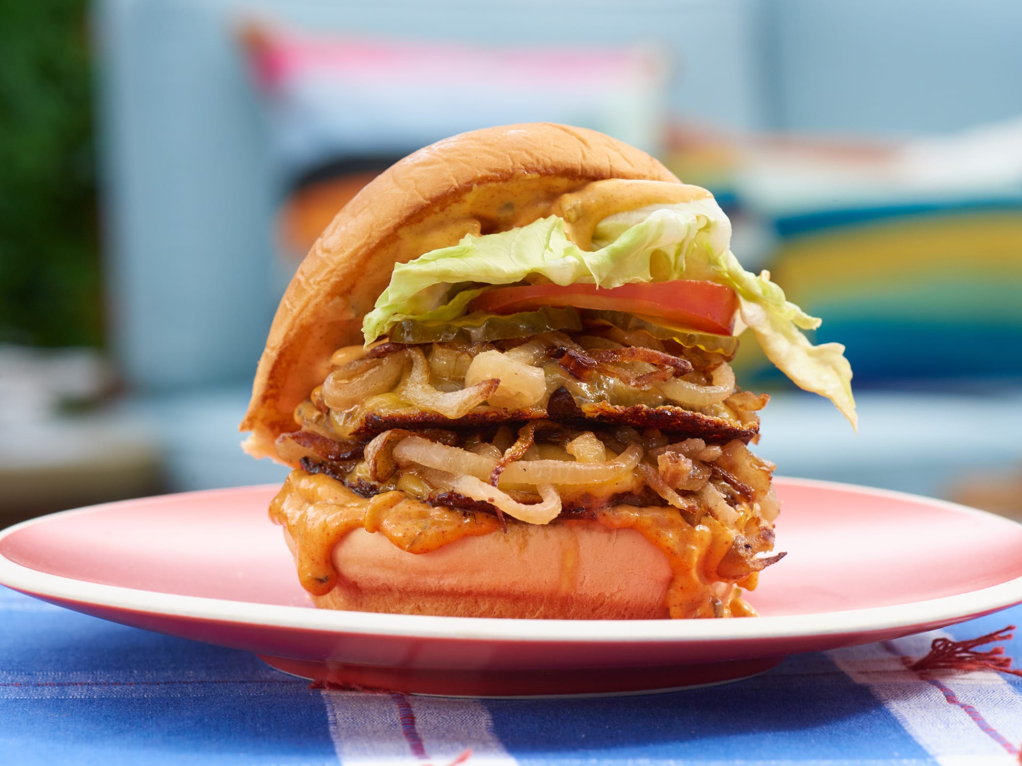 Spread some Special Sauce on each bottom bun, then add lettuce, one patty, some onions, a second patty, tomatoes, pickles, more sauce, and a top bun. Serve.