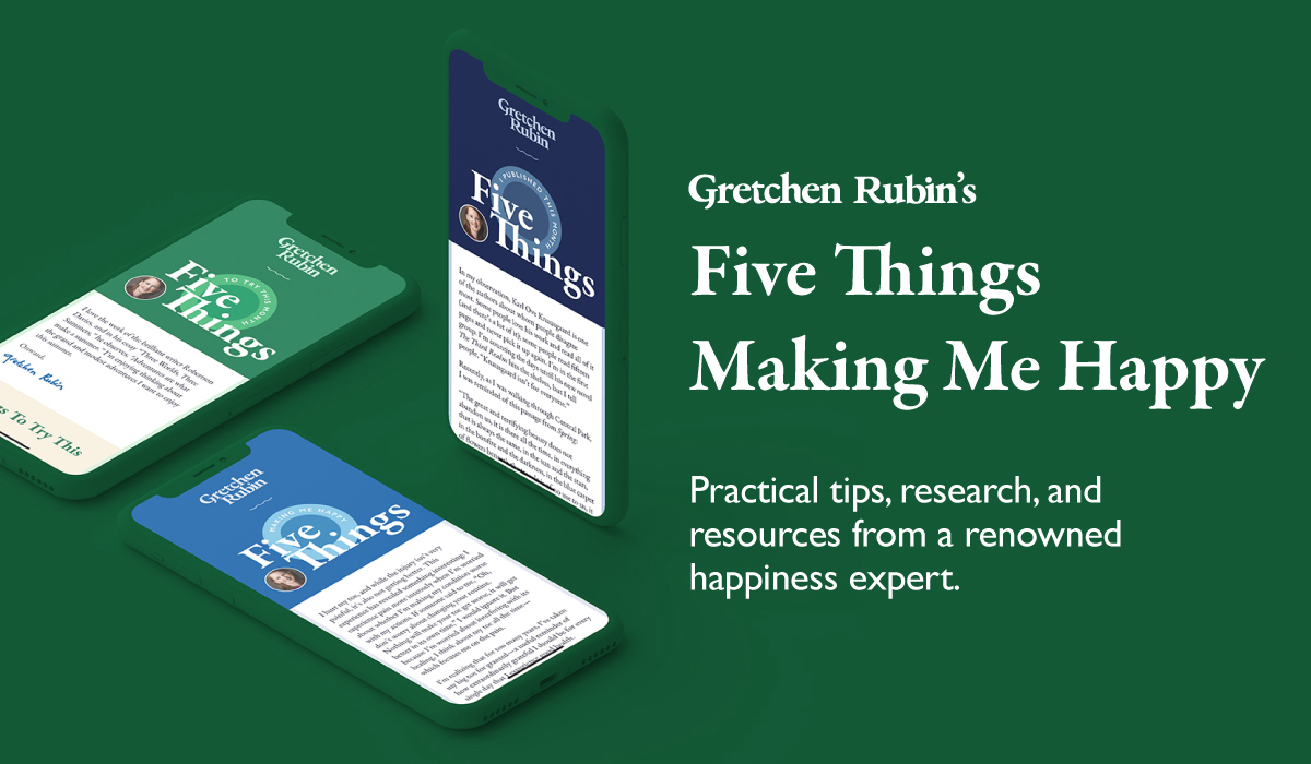 From renowned happiness expert and New York Times bestselling author Gretchen Rubin, the Five Things Making Me Happy newsletter curates practical tips, hacks, and tools to help make our lives happier, healthier, more productive, and more creative. You’ll also get a weekly round-up of what’s making Gretchen happy, plus insightful observations and research. Join more than one million subscribers and sign up for free.