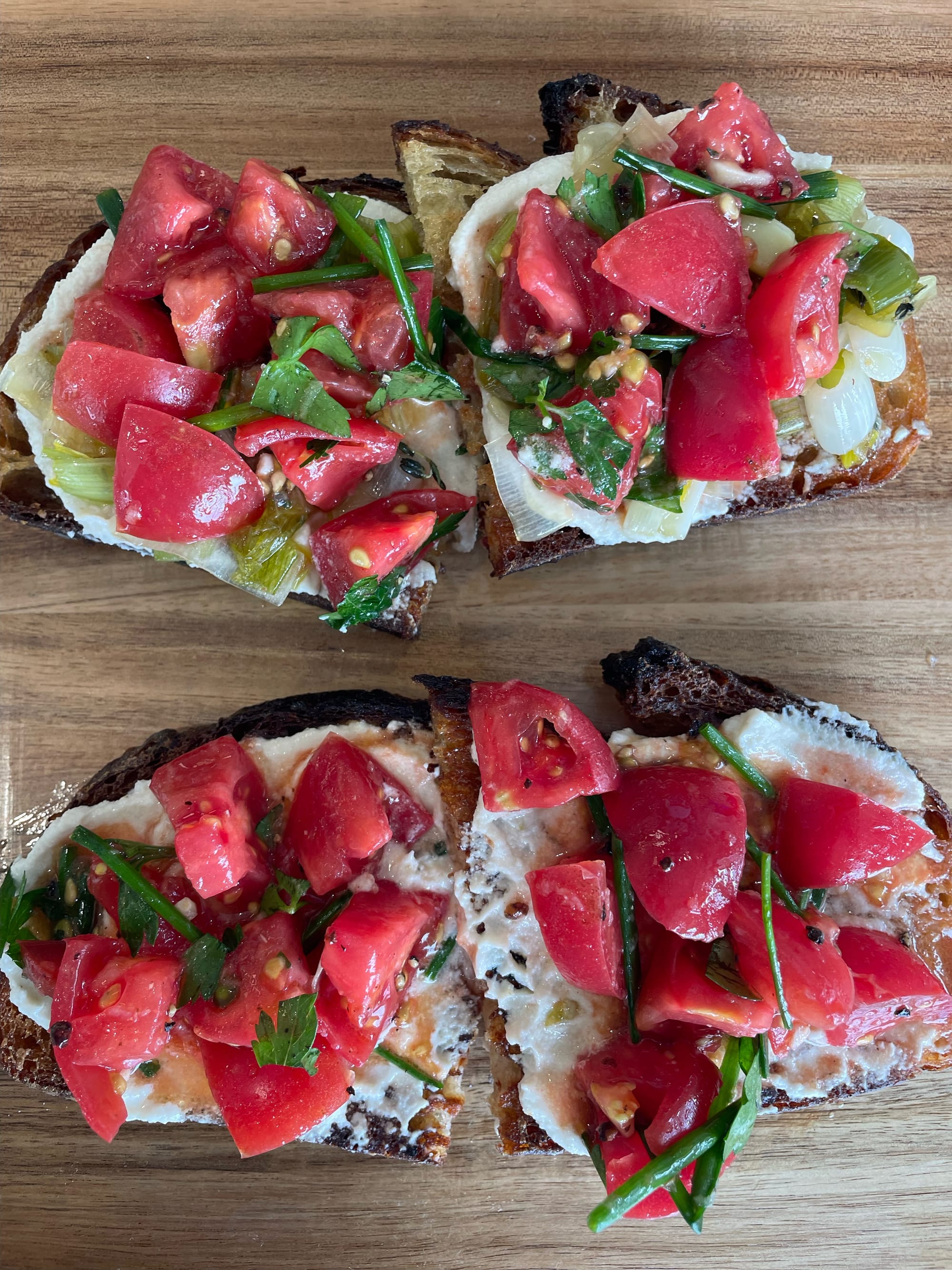 2. Pile the leeks on first, and then the tomatoes high on top of the bread.