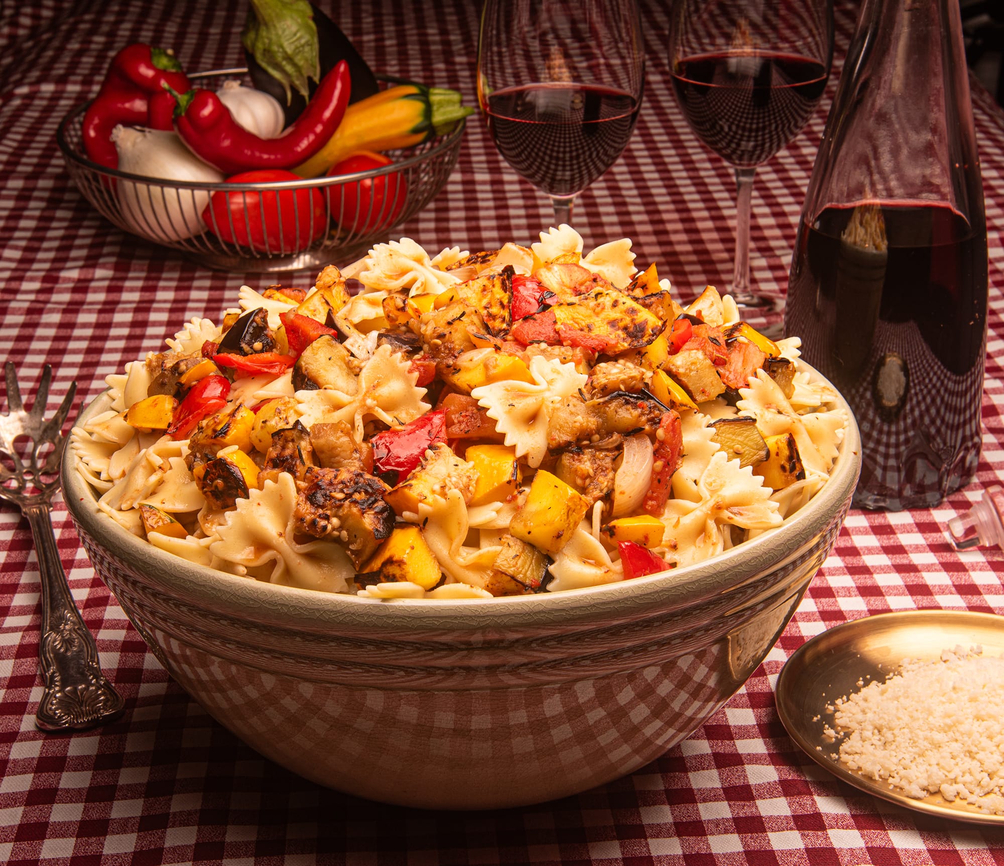 - SERVE. Drain the pasta, move it to a big bowl, pour on the tomato sauce, then pile on the rest of the veggies. Garnish and gently mix the herbs and Parmigiano in so they warm and exude their perfume. If you like, do as they do in Italy, and drizzle a high-quality olive oil over the top of each individual serving (especially if you plan to serve it cold).