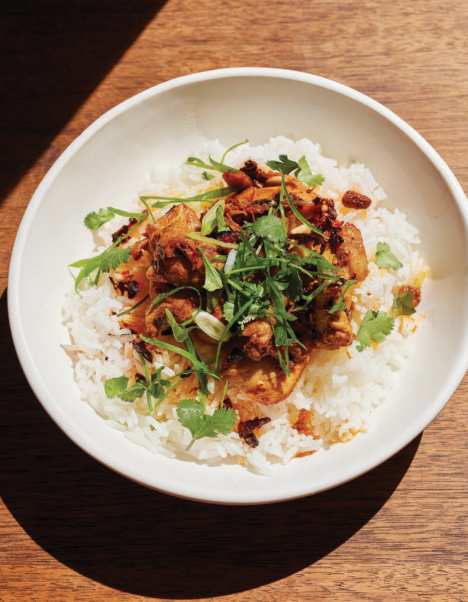 When my friend Ian gifted me a jar of a new brand of chili crisp that he loved, I quickly became obsessed. Determined to see how many dishes I could make using this richly flavored, heat-filled condiment before I reached the bottom of the jar, I immediately made this simple chicken dinner with a kick. Serve it with Miso-Coconut Rice with Greens (page 48), plain rice or greens you have on hand.