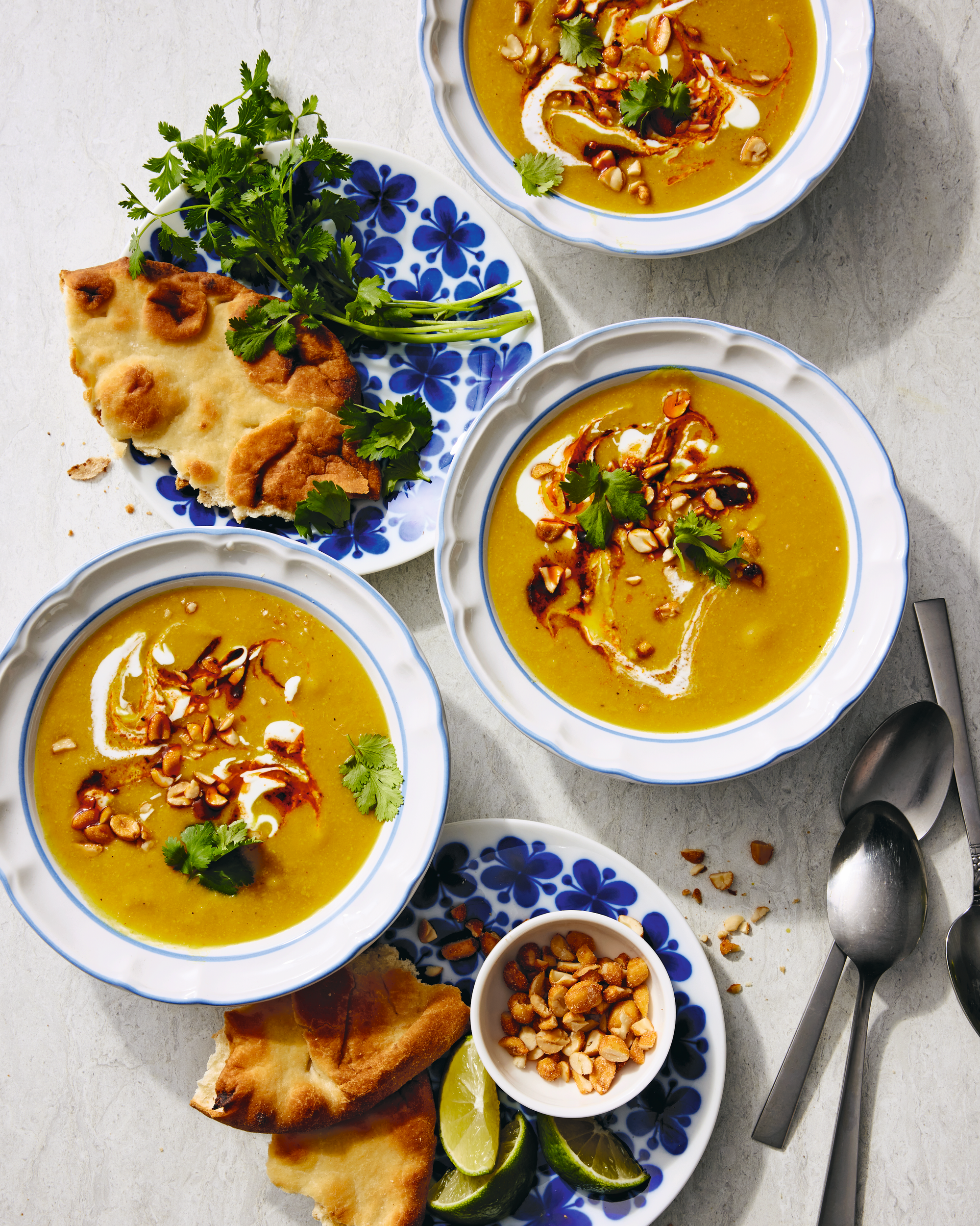 5. Top and serve: Ladle the soup into bowls and top with cilantro, peanuts, a spoonful of Greek yogurt (if using), and hot sauce. Serve with naan.