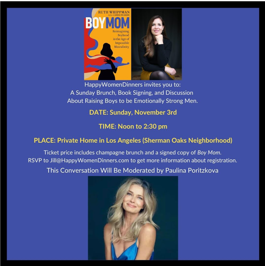 Food writer, cook, and publicist Jill Daniel launched Happy Women Dinners in 2017 to bring women together for inspirational, organic dinners featuring exclusive speakers who focus on women’s growth and empowerment. Held in various locations at private homes in LA, Nashville, Philadelphia, Washington, D.C. and more, these dinners have featured thought leaders and authors like Eve Rodsky and Dr. Judith Orloff. If you’re in the LA area, don’t miss an exciting event on November 3 with Boy Mom author Ruth Whippman, who will be discussing how to raise emotionally strong men with supermodel and Open Field author Paulina Porizkova.